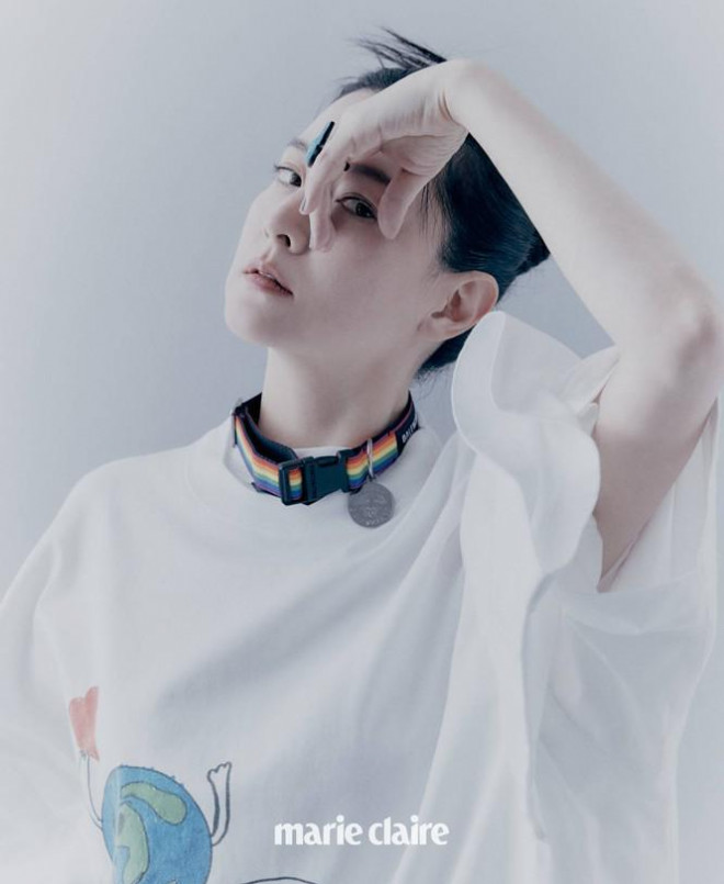 Trang điểm nhẹ gần như để mặt mộc, diện đồ oversized tông trắng đen tối giản của thương hiệu danh tiếng Balenciaga, Lee Young Ae đem đến một làn gió mới trên tạp chí Marie Claire Hàn số tháng 2/2021.