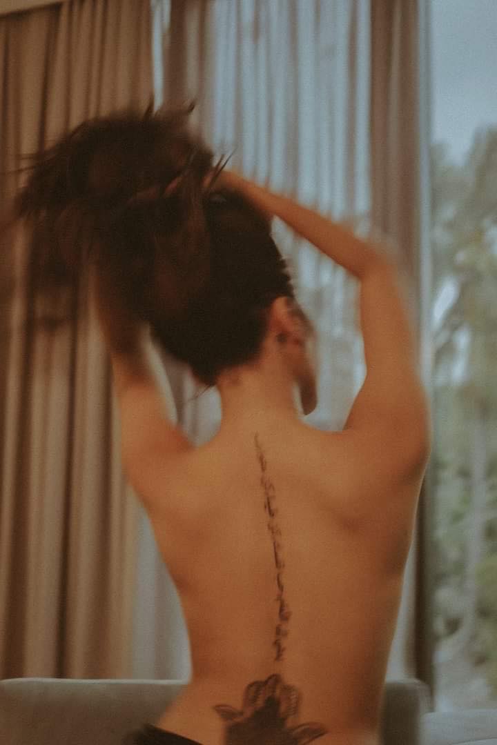 Vũ Thảo My bán nude khoe hình xăm lớn sau lưng.